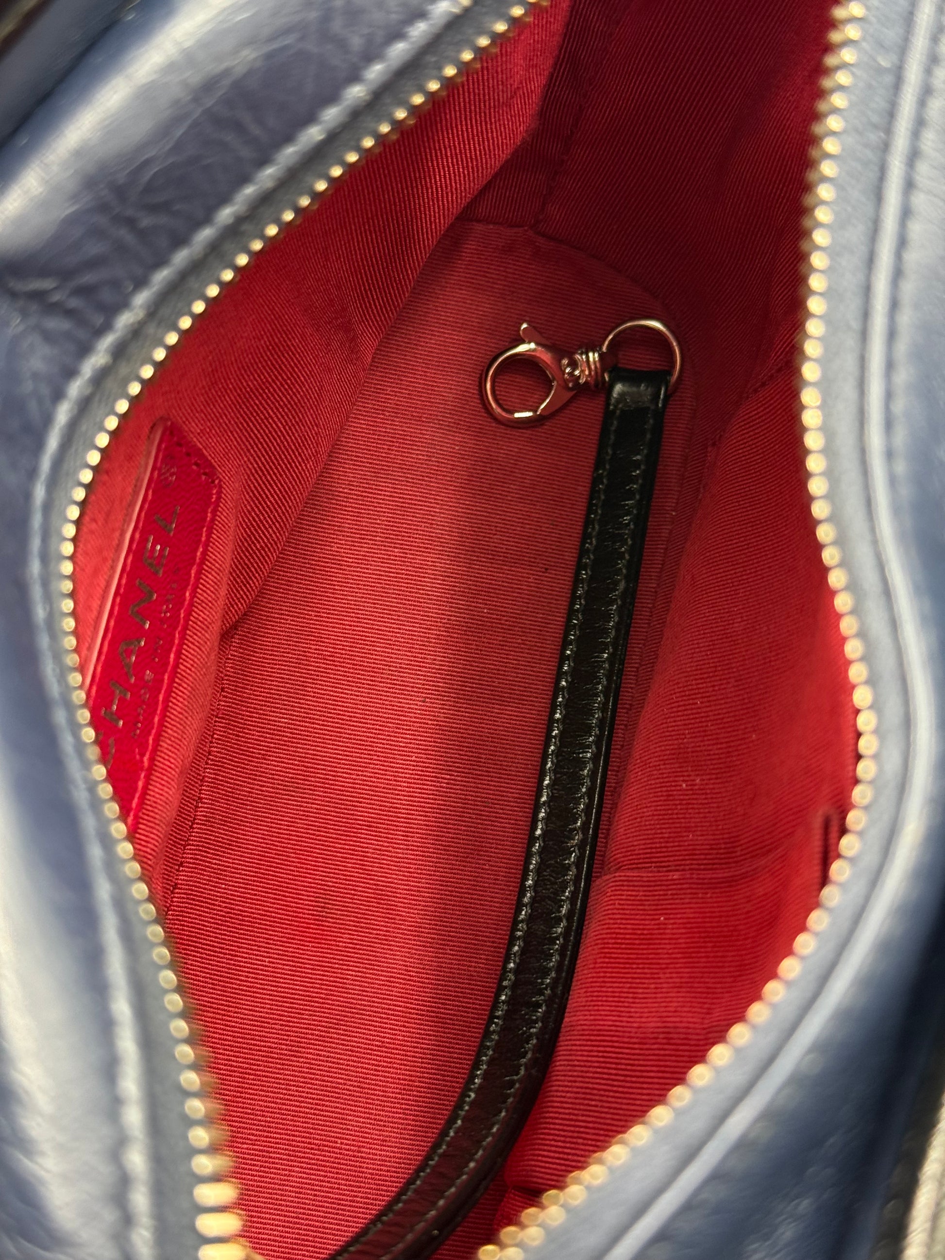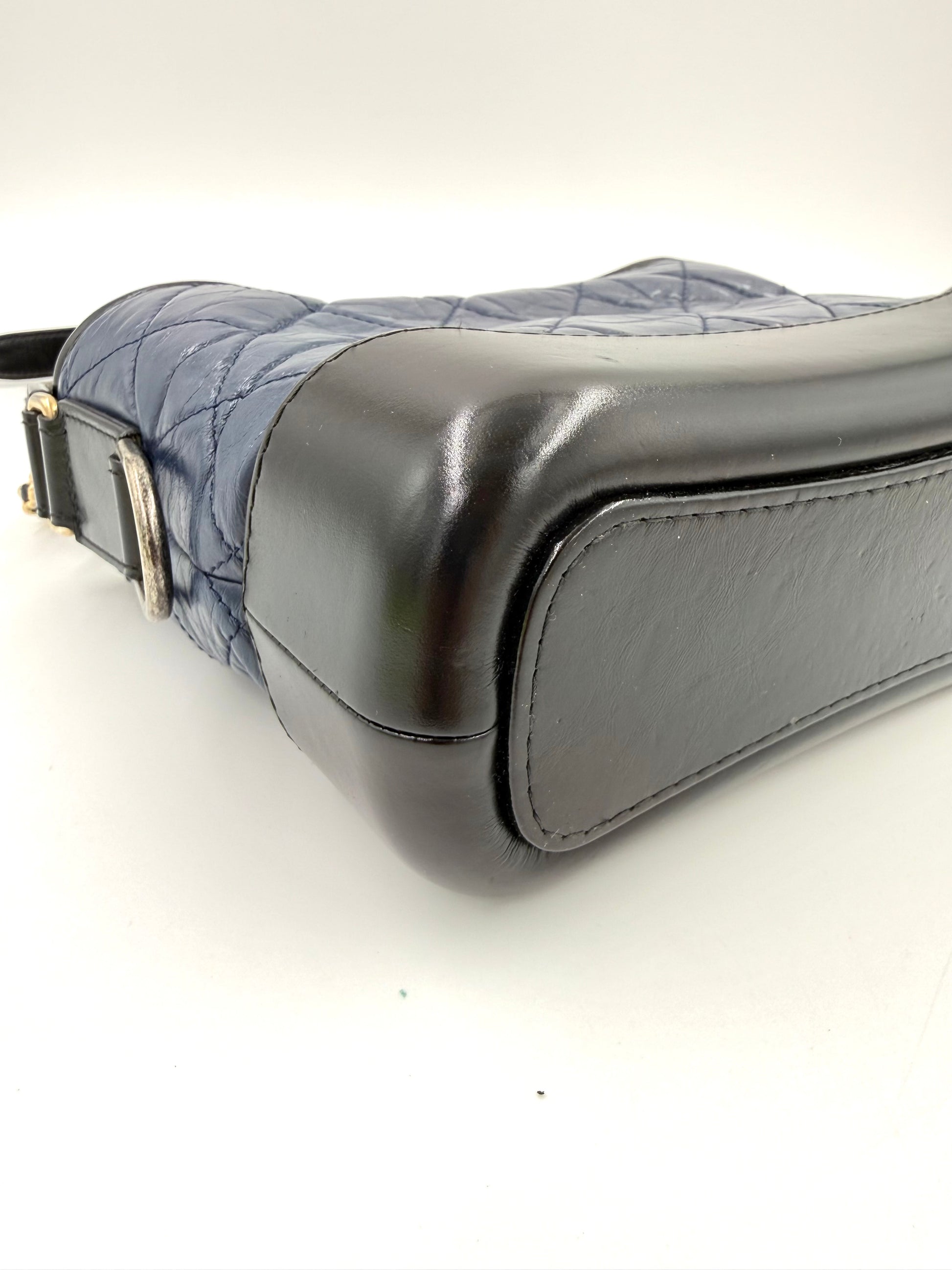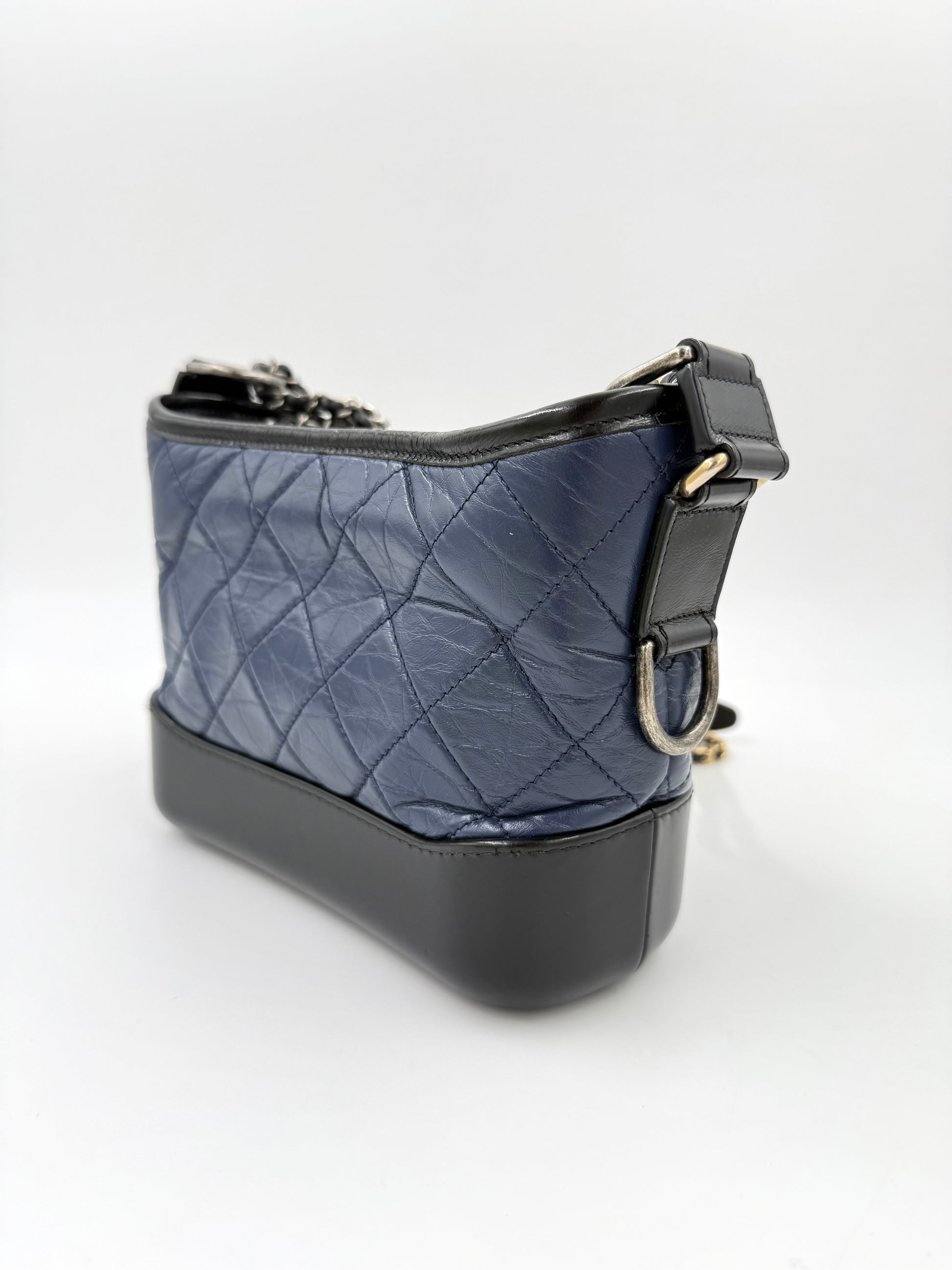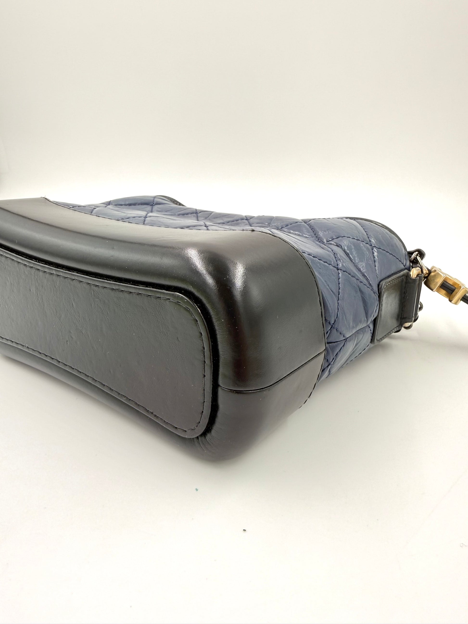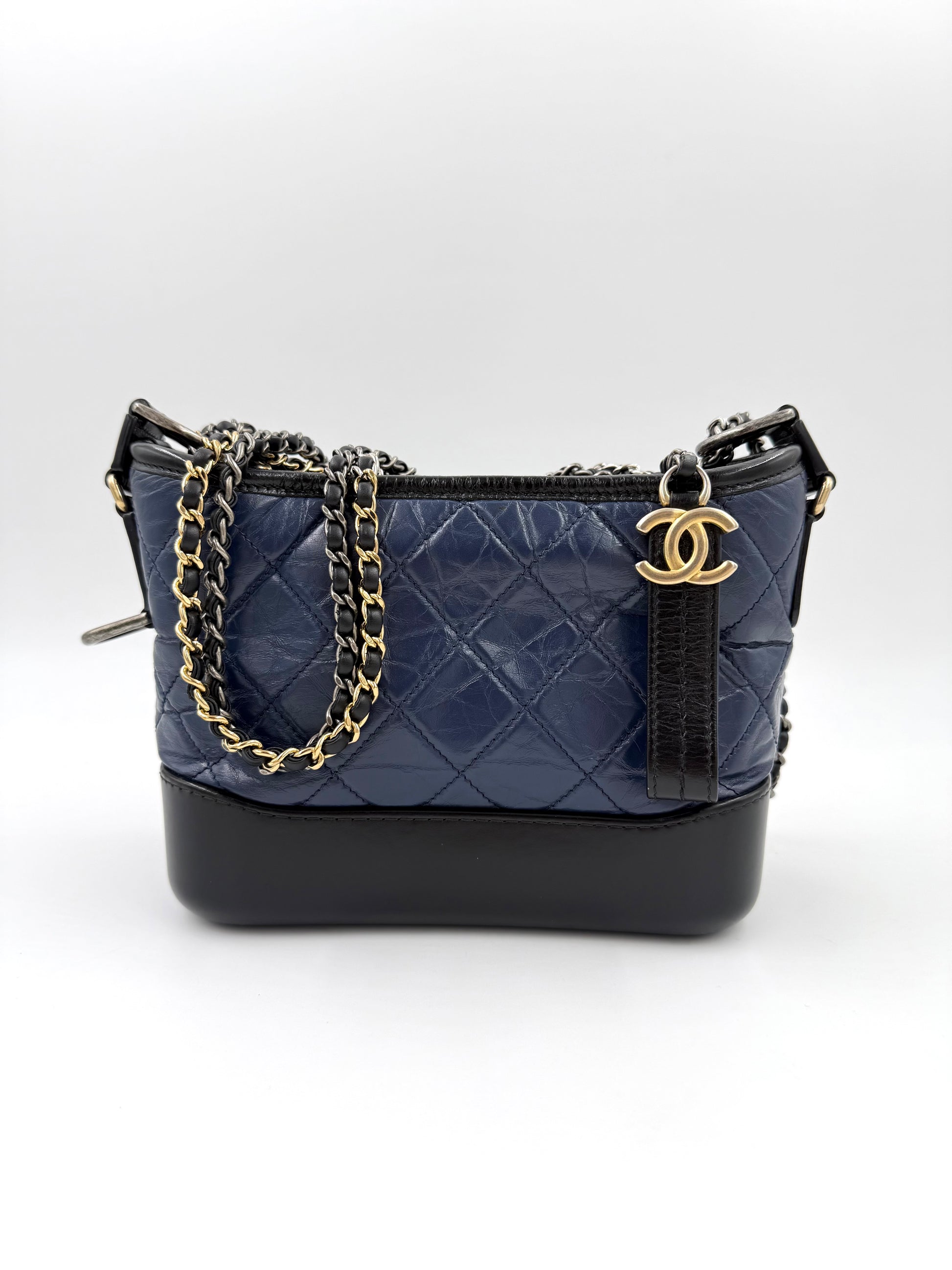 Dann bist du mit der neuwertigen Chanel Gabrielle small navy optimal beraten, denn mit der selten gesehenen Luxustasche kombinierst du mühelos alle Farben der kühlen Jahreszeit. Sie macht sich genauso gut zu einem dunkelblauen Blazer und Pumps wie auch zu Skinny-Jeans und Sneakern.