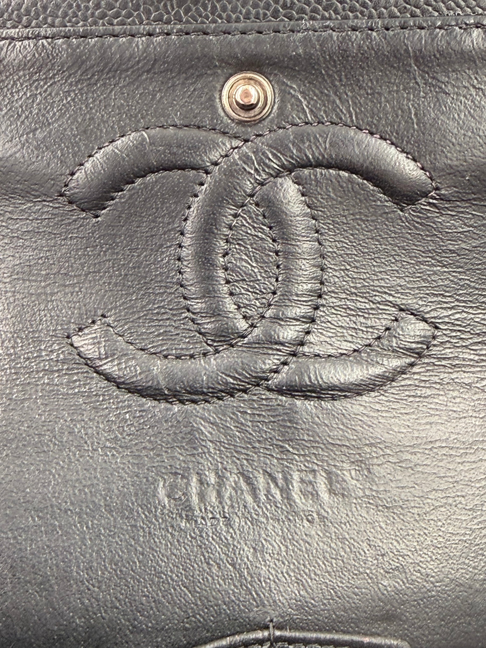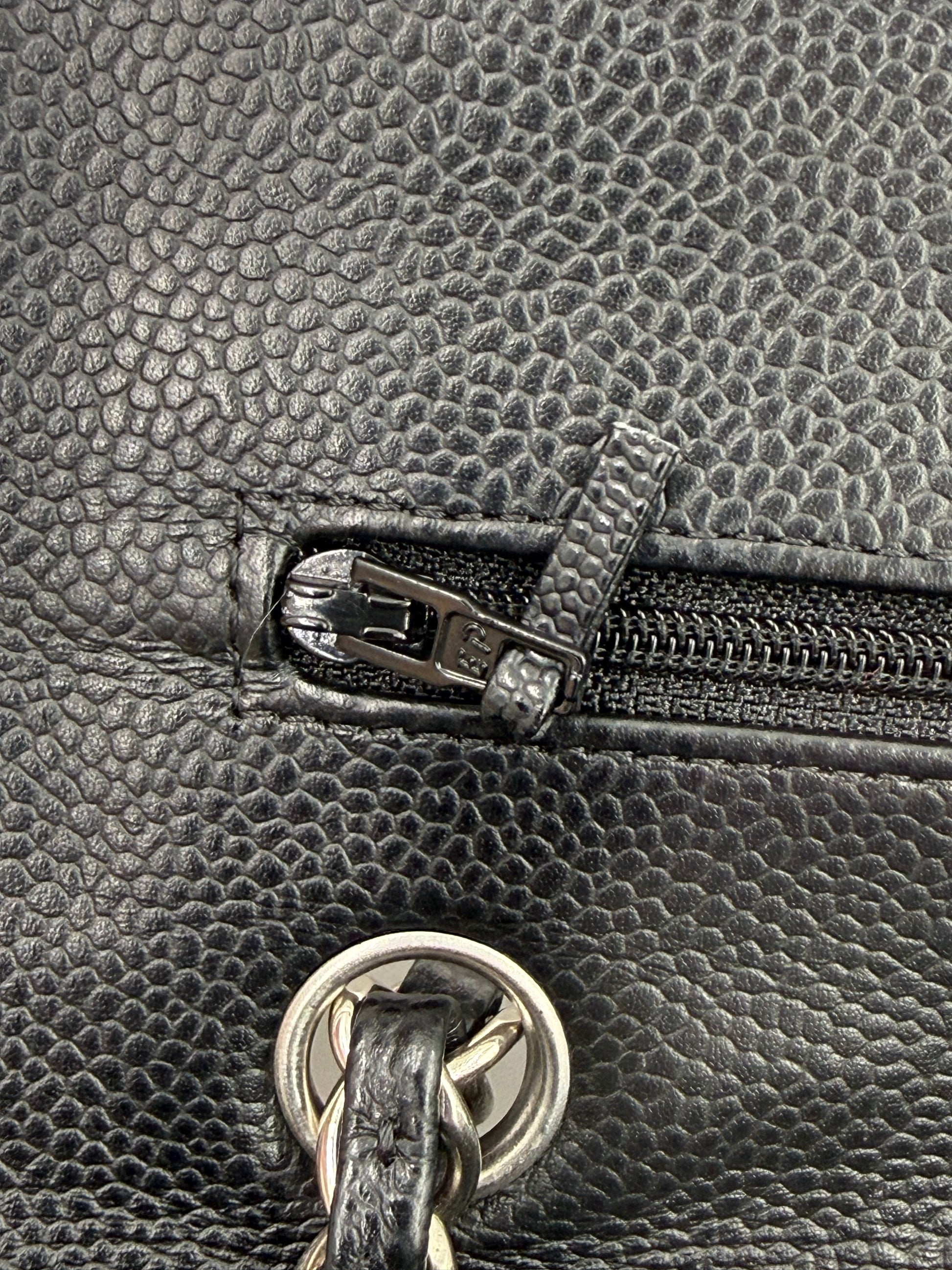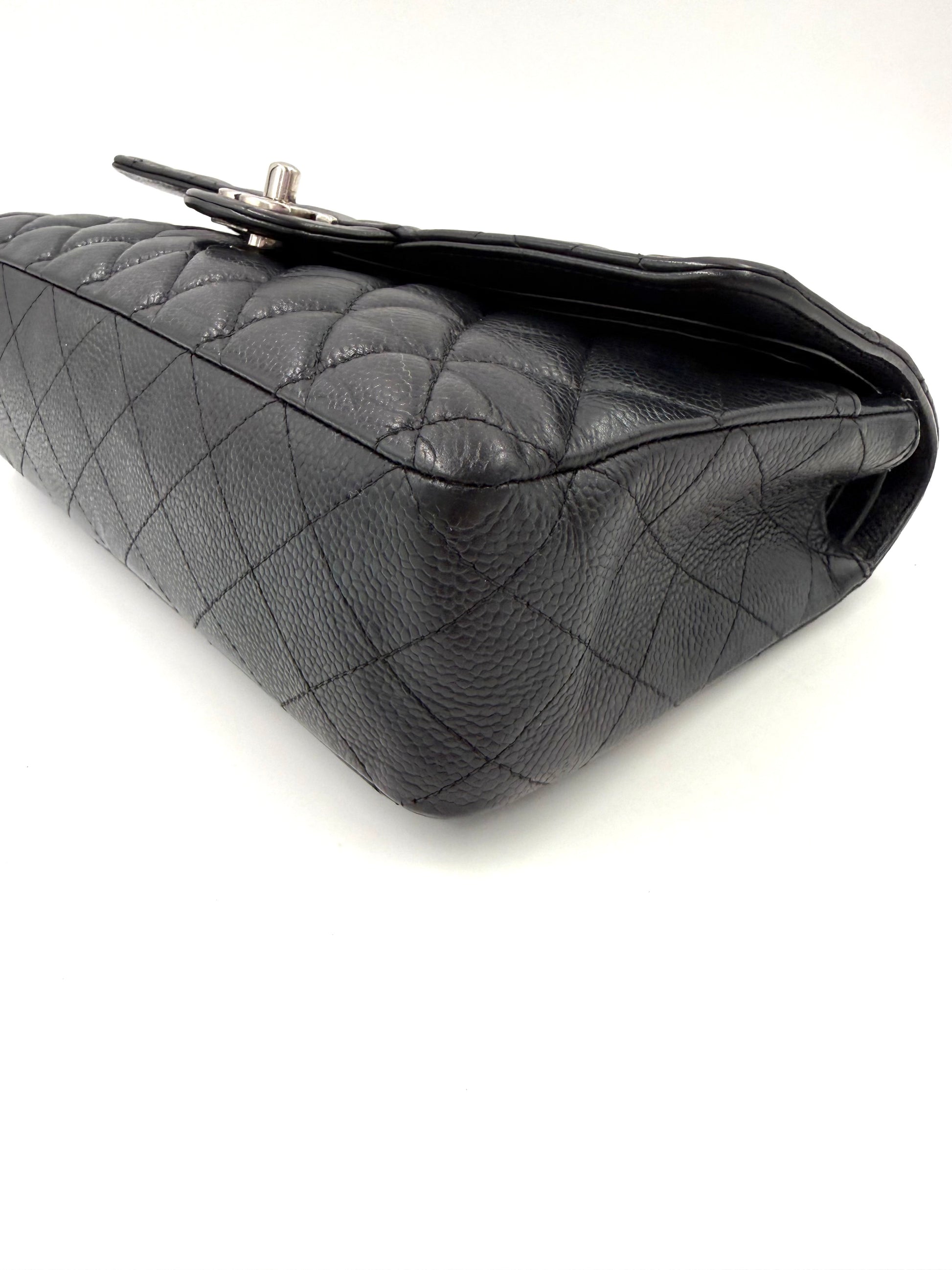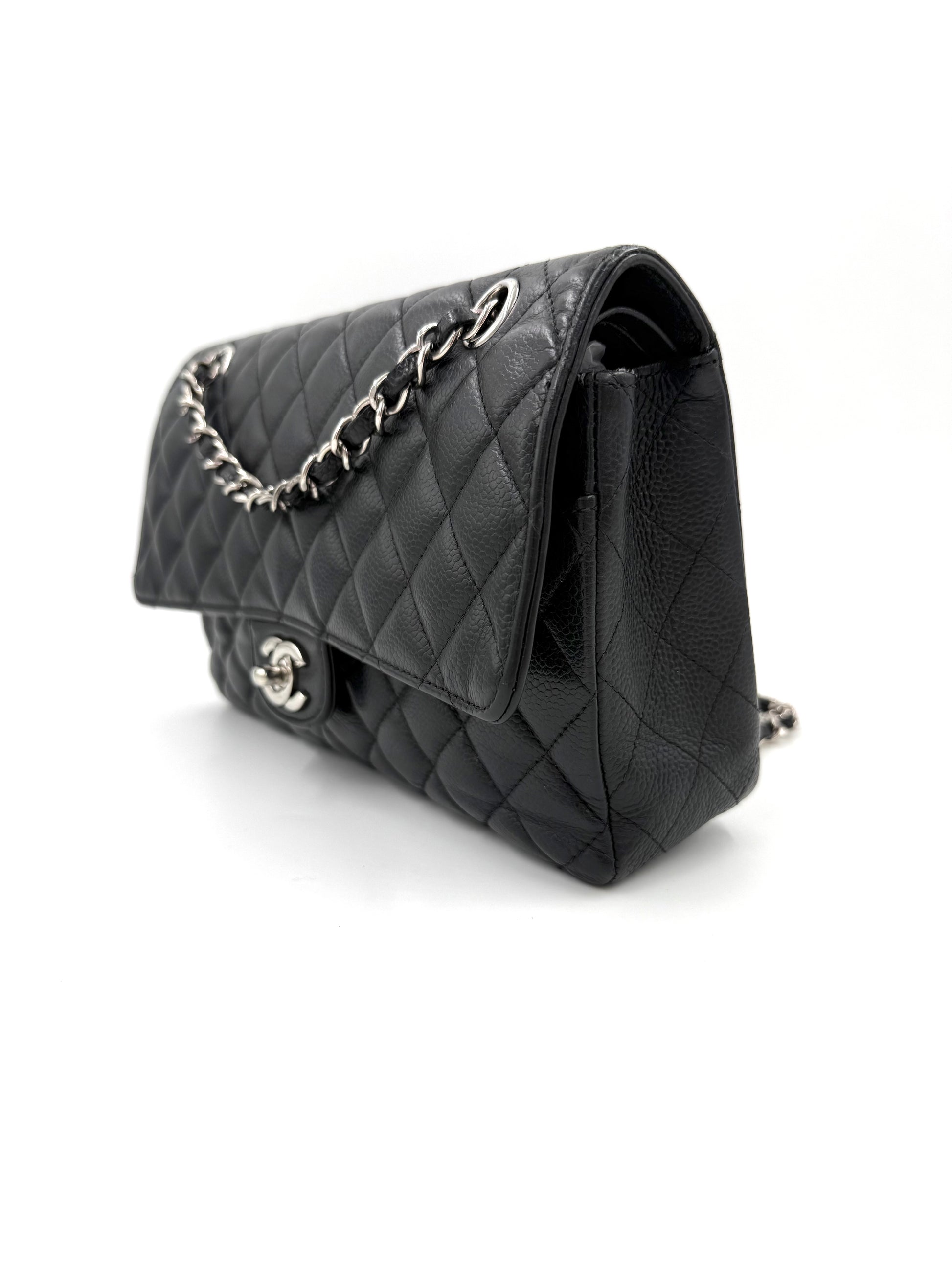 Diese gebrauchte Chanel Timeless Double Flap Bag aus schwarzem Caviarleder in der praktischen Größe medium ist aus robustem Caviarleder gefertigt und ist somit widerstandsfähiger gegen Kratzerchen.