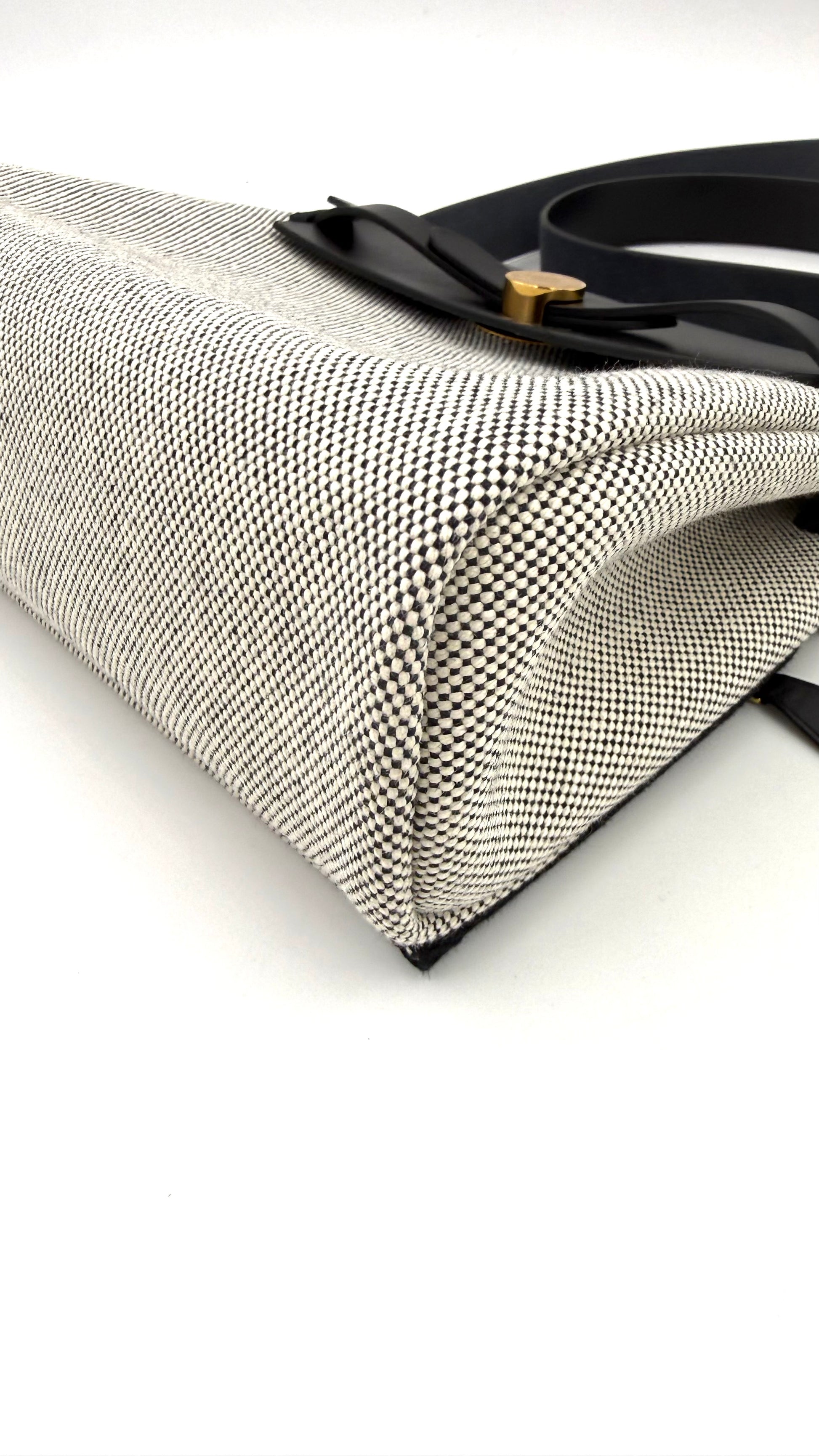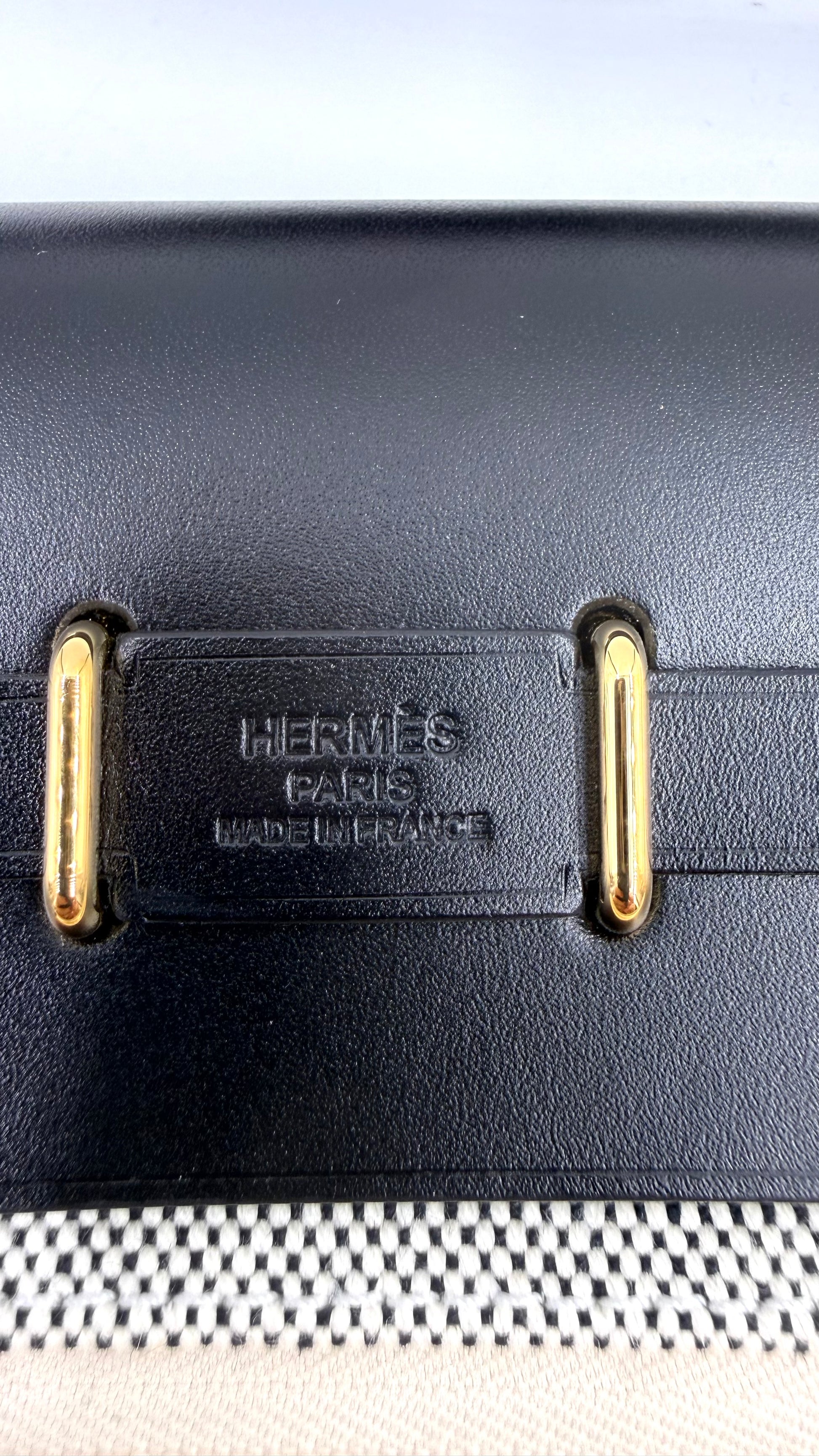 Diese Hermès Tasche aus zweiter Hand ist aus beigem Canvas und schwarzem Leder gefertigt. Ihre Hardware ist vergoldet. Hermès verwendet in seinen Designs immer nur das Beste vom Besten – so ist auch das Canvas ein extrem hochwertiges Material, das äußerst langlebig ist.