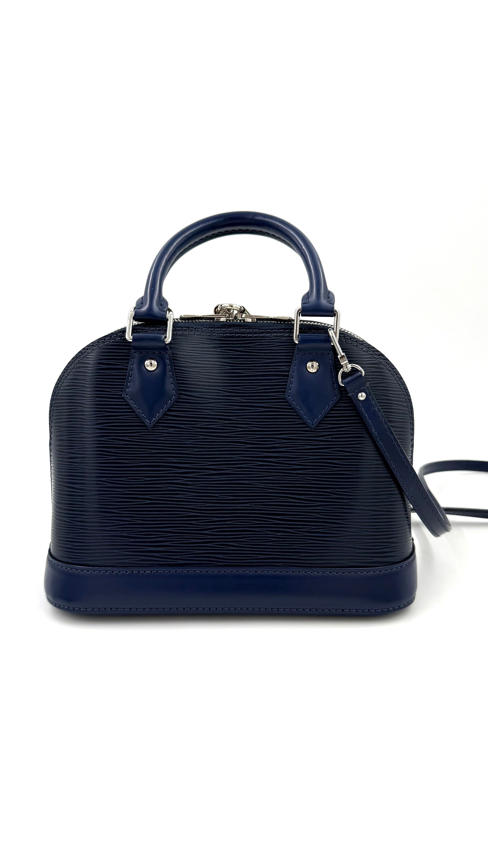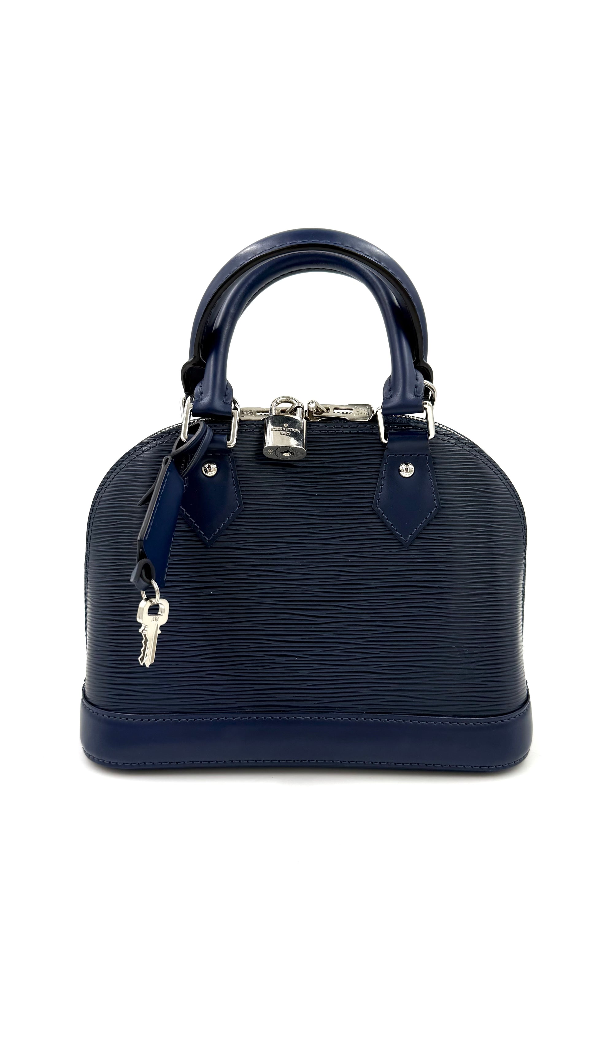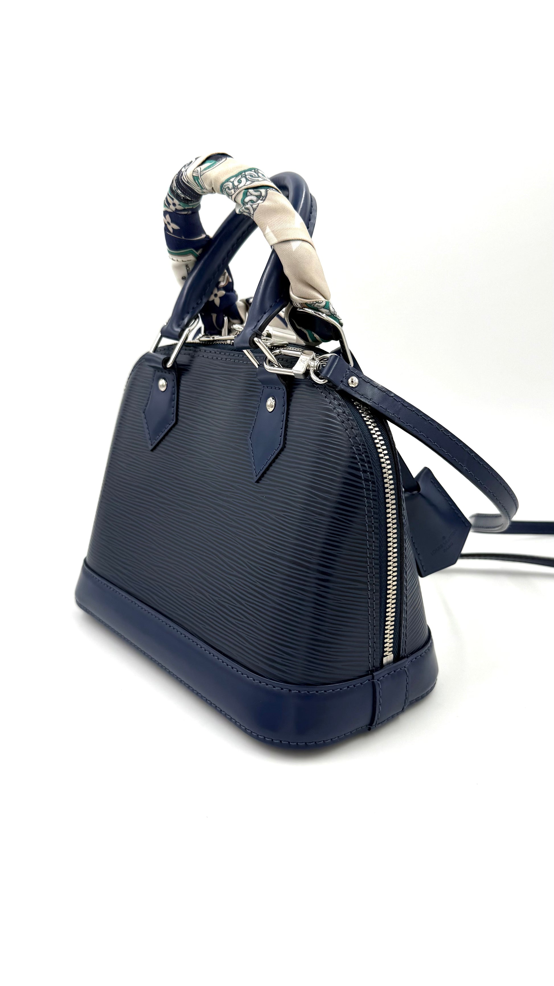 Alle Silber-Liebhaberinnen aufgepasst: Louis Vuitton verwendet zuallermeist goldene Hardware. Diese Louis Vuitton Alma BB aus indigoblauem Epi-Leder aber verfügt über silberfarbene Hardware, was äußerst selten bei Louis Vuitton der Fall ist.