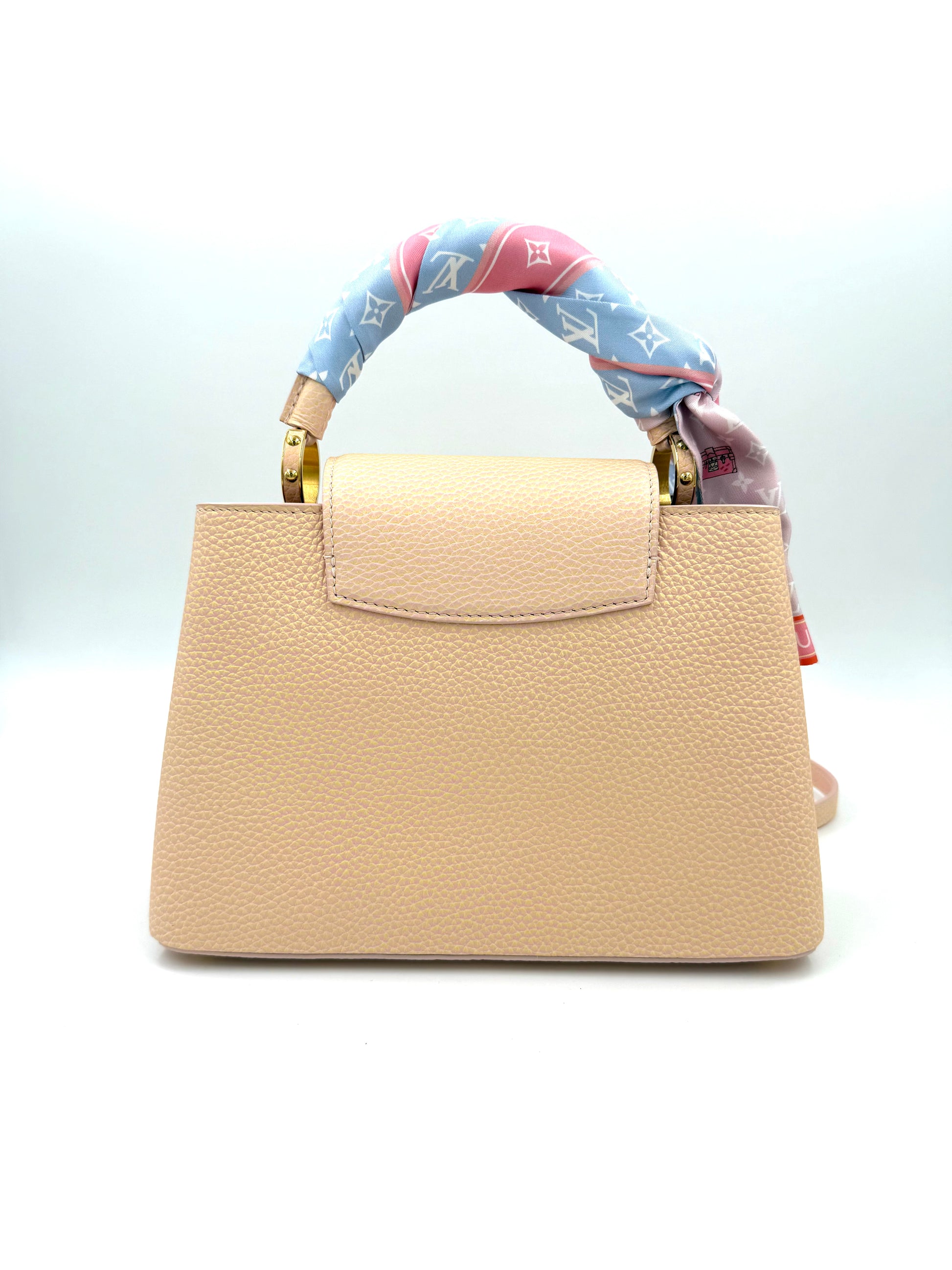 Wusstest du, dass die Louis Vuitton Capucines BB nach der Rue Neuve-des-Capucines in Paris benannt wurde, wo das erste Louis Vuitton Geschäft eröffnet wurde? Mit dieser hübschen Designerhandtasche trägst du also ein Stück Modegeschichte mit dir herum. Dank des hellen Farbtons dieser Secondhand Designertasche hast du mit ihr viele Kombinationsmöglichkeiten. Trage die LV zum Beispiel abends zu einem dunkelbraunen Wollkleid oder einem kurzen schwarzen Kleid.