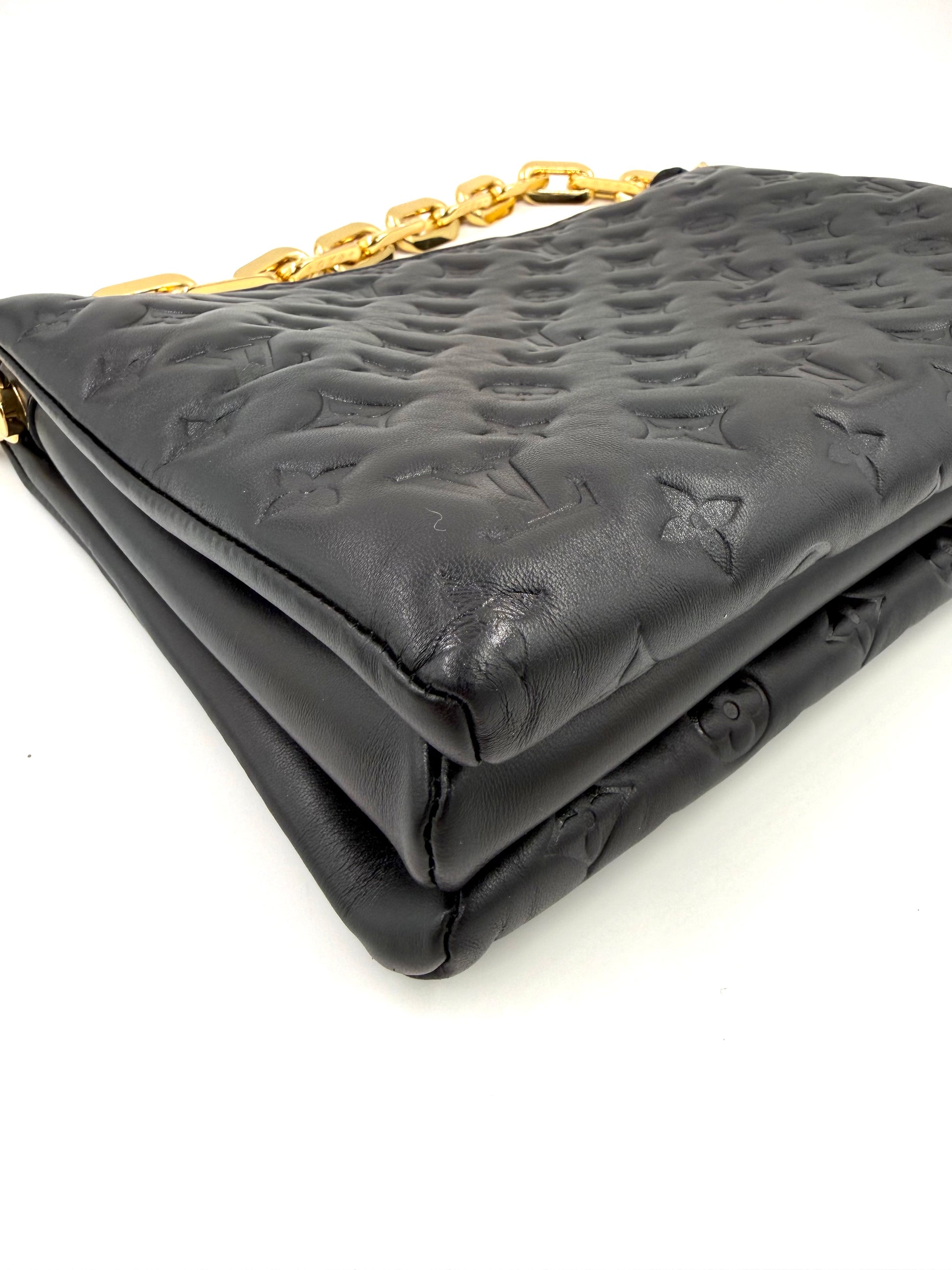 Die neuwertige Second Hand Louis Vuitton Coussin MM schwarz aus erhabenem Lammleder mit Monogram-Prägung zählt zu den Highlights der Frühjahr Sommer 2021 Fashion Show des französischen Designhauses.