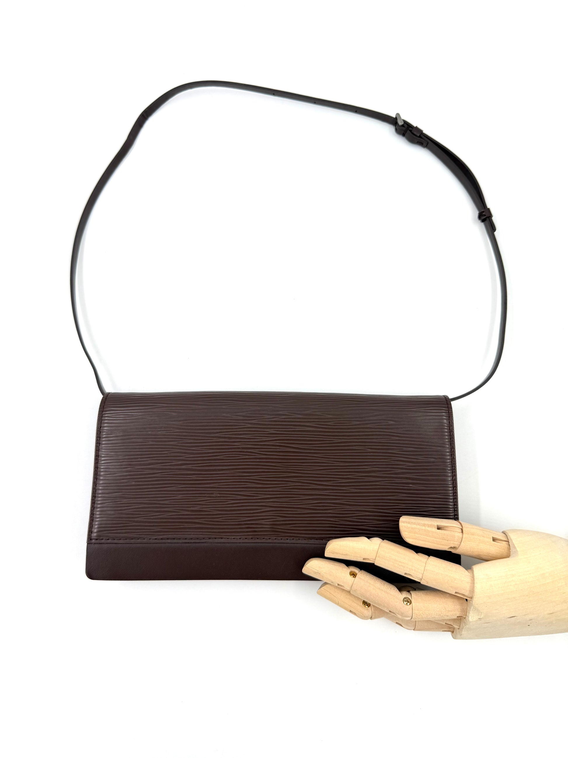 Wenn du auf der Suche nach einer eleganten Abendtasche bist, die sich ebenso gut für ein Dinnerdate eignet wie für einen Tageslook, dann ist die Louis Vuitton Honfleur aus mokkafarbenem Epi-Leder genau das Richtige für dich. Kombiniere sie tagsüber mit einer Skinny Jeans und einem Rollkragenpullover und am Abend mit hohen Schuhen und dem kleinen Schwarzen.