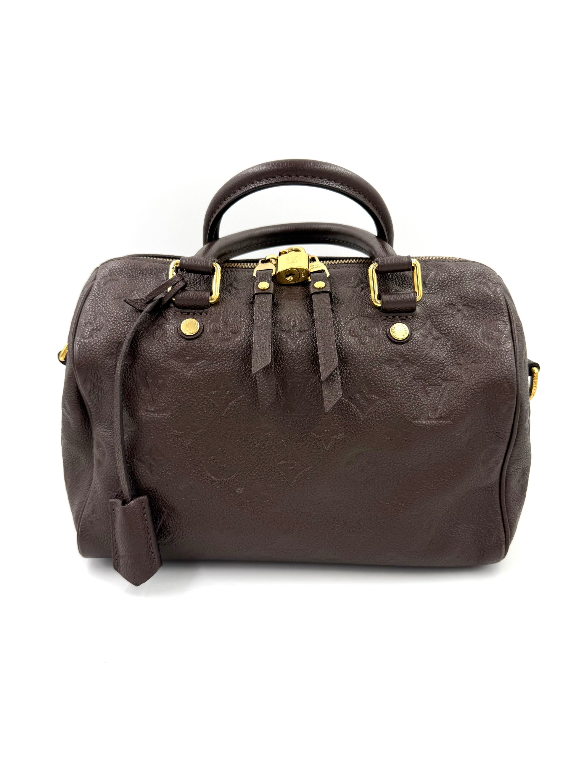 Trage die Louis Vuitton Speedy Soft Monogram Empreinte braun lässig in der Hand, elegant in der Armbeuge oder bequem über der Schulter – dank des abnehmbaren und längenverstellbaren Riemens hast du die Wahl. In ihrem Inneren finden Handy, iPad, Brillenetui und Geldbörse ihren Platz.